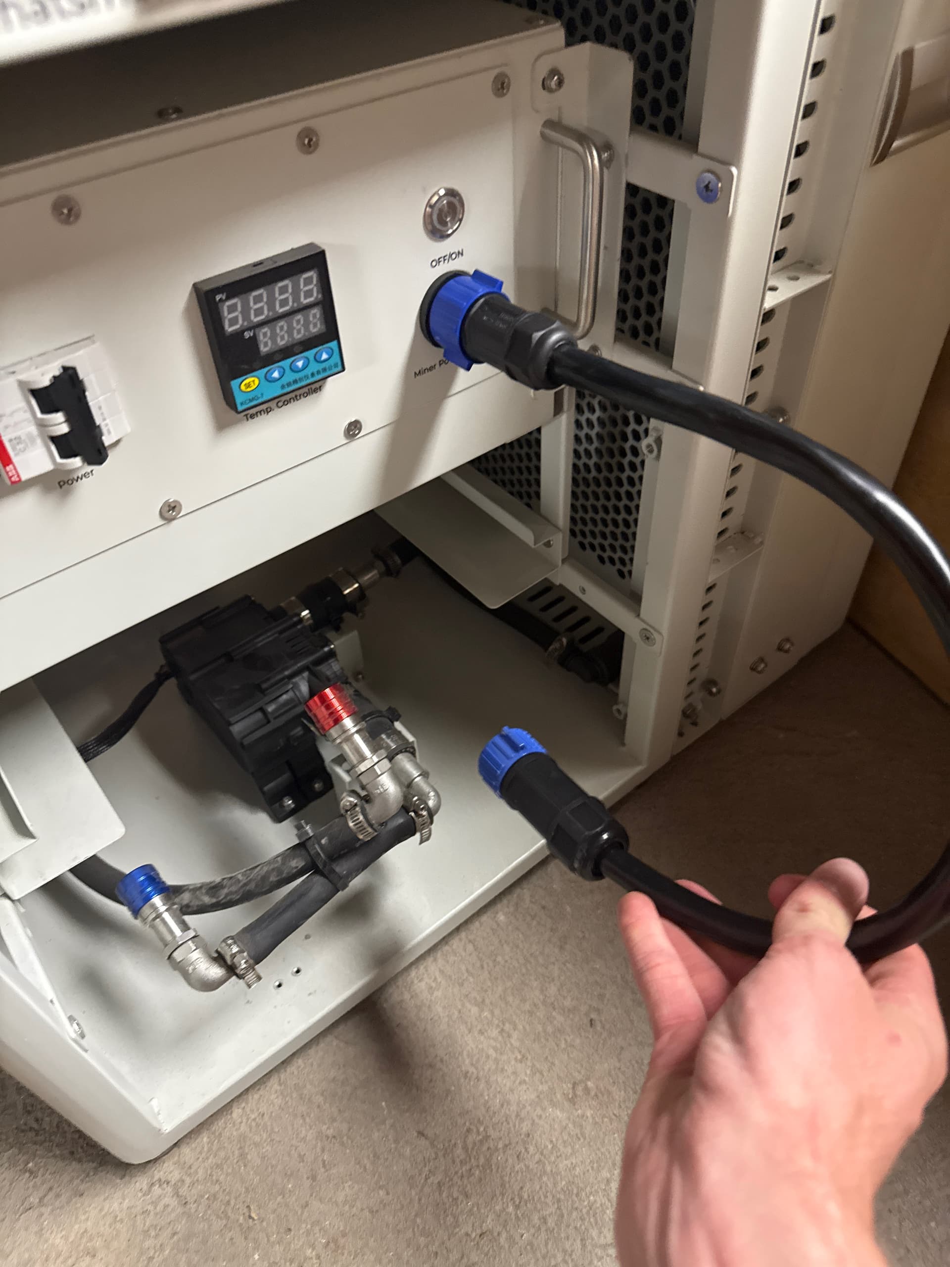 The dry cooler is pretty quiet. I’m impressed. It dynamically ramps up and down to maintain the desired water inlet temperature to the M64 miner.