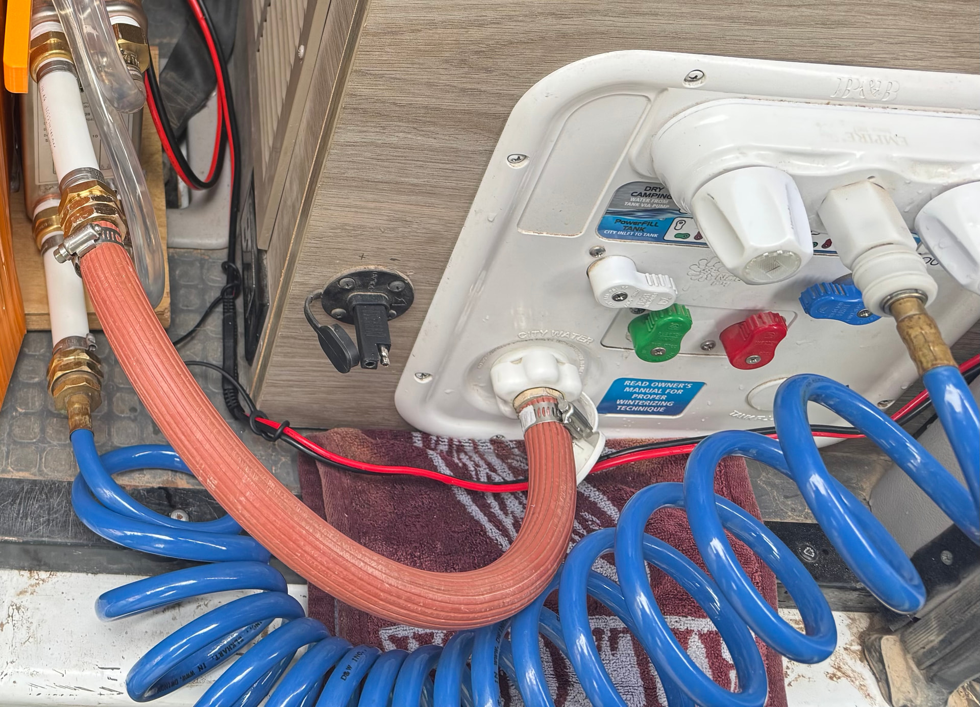 On the van side, I hook our sprayer hose (blue) up to the heat exchanger inlet and connect the outlet to the water fill port on the van. Then I crack the hot faucet on very low. I also had to figure out the non-standard configuration of the van water panel that let me pump water back in the fill port while in “dry camping” mode.