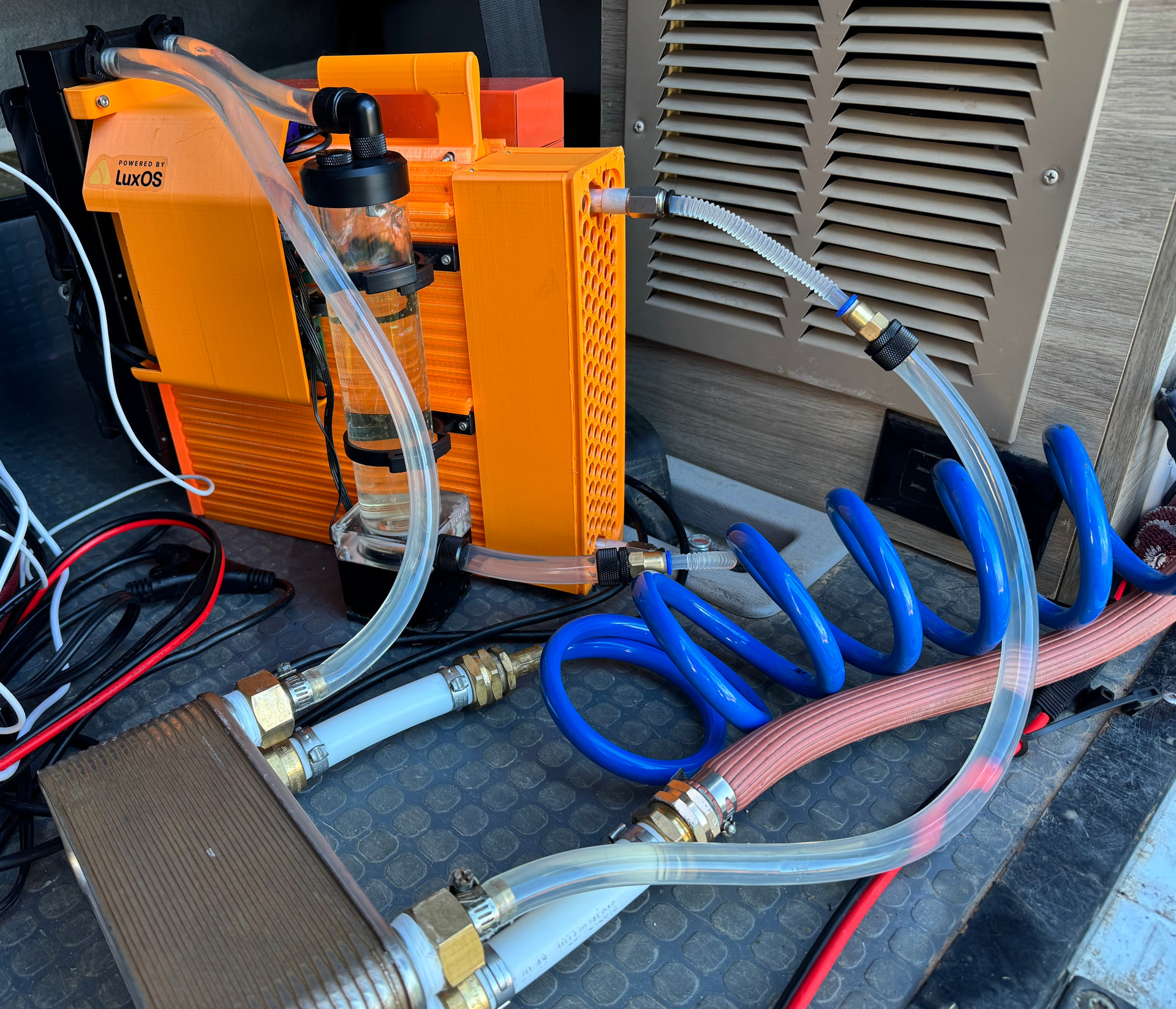 I put the heat exchanger closest to the hashboard outlet so it gets the most heat. Then if our exchanger isn’t pulling enough heat out, the radiator takes care of the rest. This also lets you use this as a basic space heater without having to change anything. Using LuxOS to manage the fans, they will only turn on once the board temp is high enough (I set target temp to 60c).