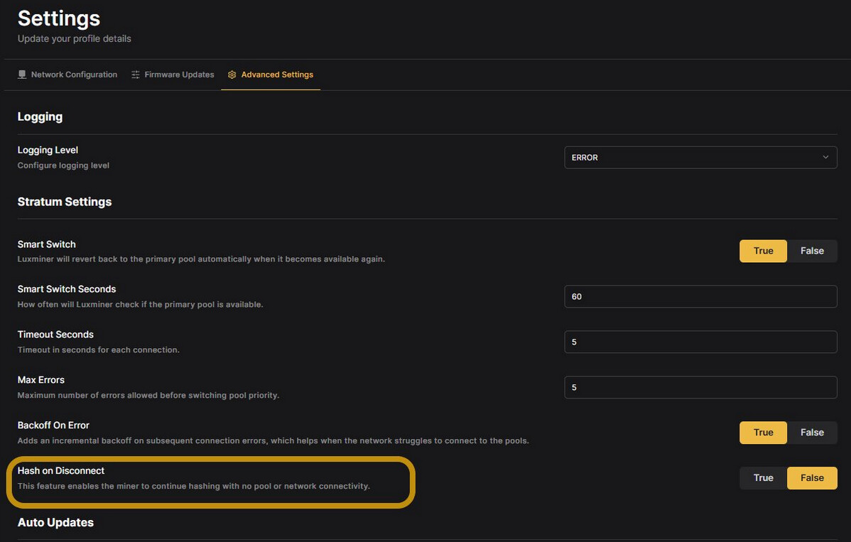 Miner Firmware: I choose to run LuxOS and have been very satisfied with the results. Structur3.io has some great power performance profiles listed at the bottom of this page. I would use those settings as a starting point, if you opt for a dual hashboard setup the TH/s double and so does the power. To get LuxOS on your miner you must install the stock Bitmain/Antminer firmware provided by LuxOS and then use LuxOS commander to install LuxOS. The ATM feature is quite handy in LuxOS to tune your miner. I have the following values set: