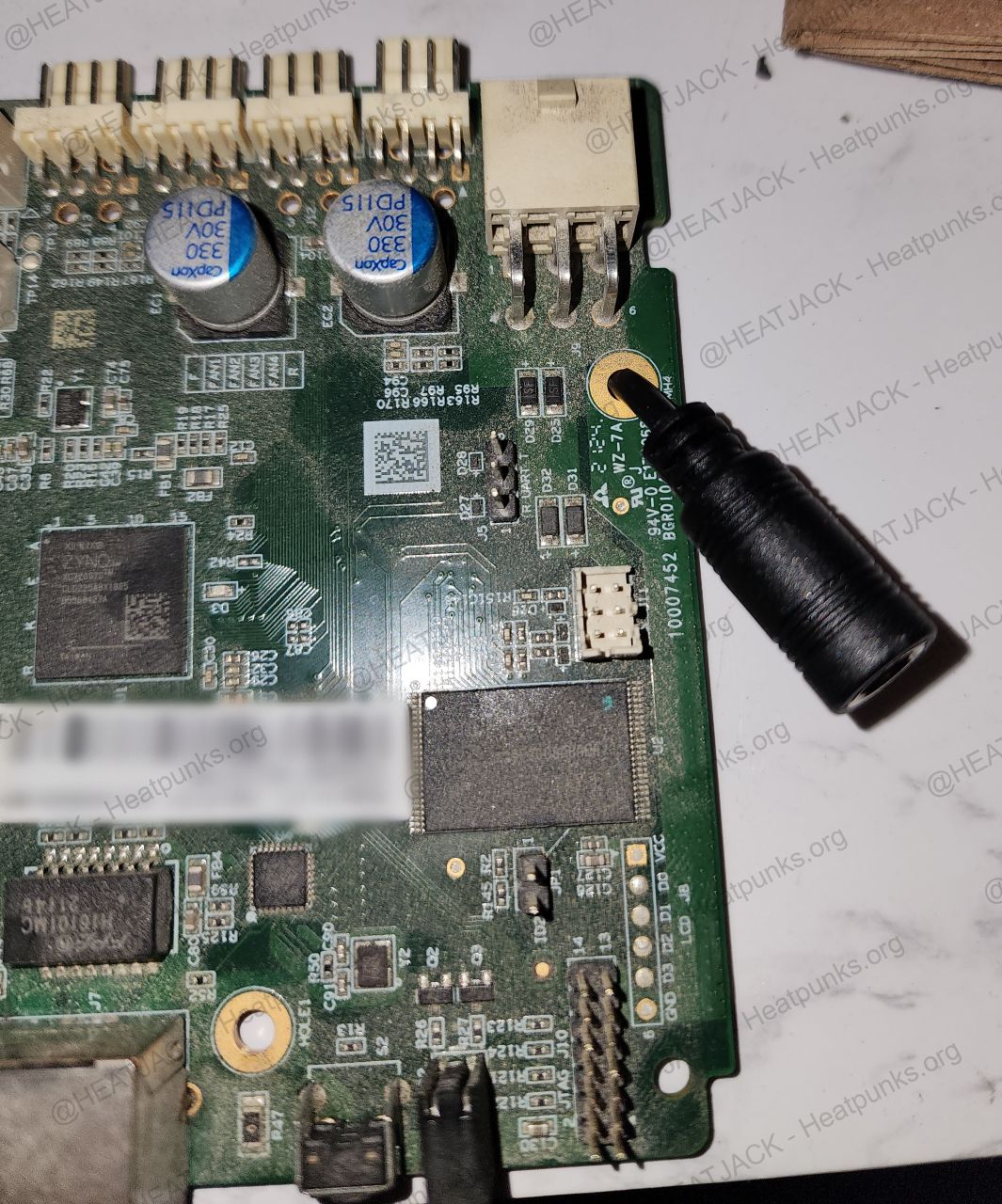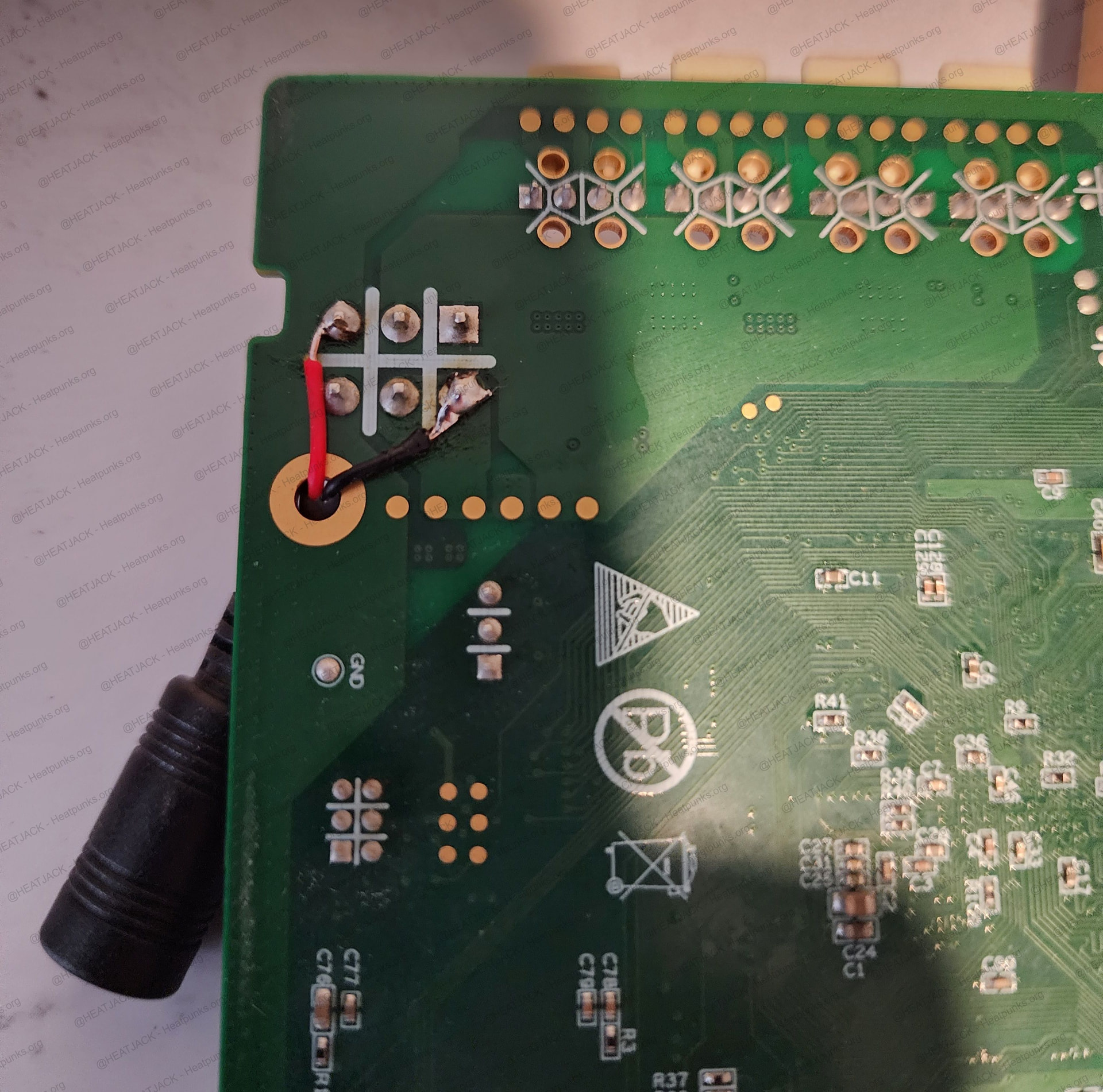 PSU Board Coating: Removing the protective coating on the PSU board can be tedious, so take your time with this step. Gently heating the area with a hot air gun or a small torch held at a safe distance softens the coating and makes it much easier to scrape away. Always do this in a well ventilated space since heating the PCB coating can release harmful fumes. (Tip: If you start to see copper, STOP! You’ve gone too far, possibly cutting copper traces. Gently cut and pick at the silver area on either side of the 0805 surface mount chip resistors on the PCB):